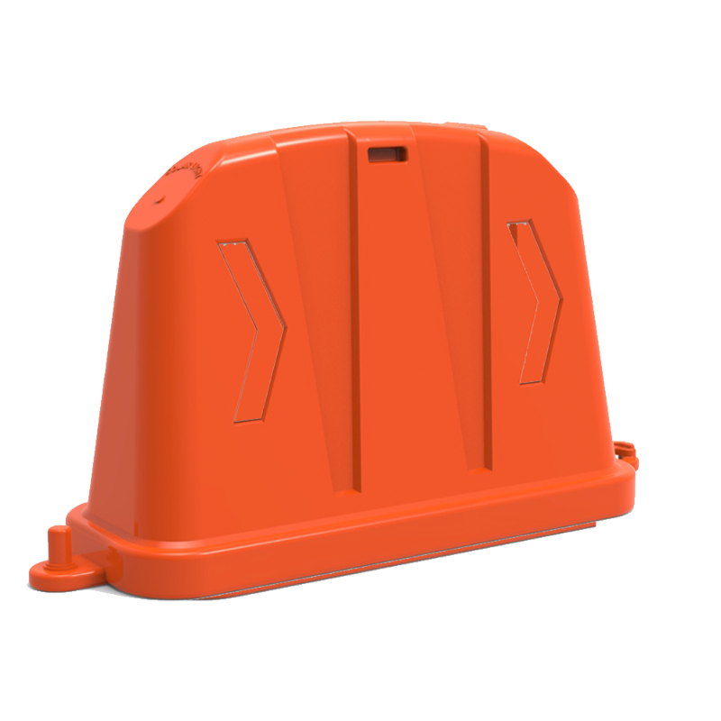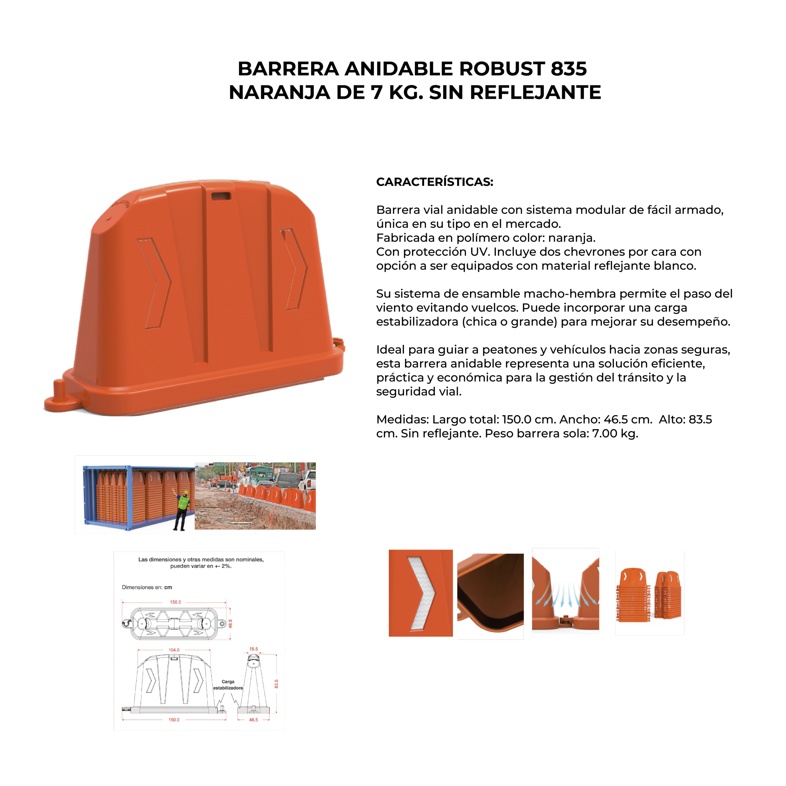 Descripción: Barrera vial anidable con sistema modular de fácil armado, única en su tipo en el mercado. Fabricada en polímero color: naranja. Con protección UV. Incluye dos chevrones por cara con opción a ser equipados con material reflejante blanco. Su sistema de ensamble macho-hembra permite el paso del viento evitando vuelcos. Puede incorporar una carga estabilizadora (chica o grande) para mejorar su desempeño. Ideal para guiar a peatones y vehículos hacia zonas seguras, esta barrera anidable representa una solución eficiente, práctica y económica para la gestión del tránsito y la seguridad vial. Medidas: Largo total: 150.0 cm. Ancho: 46.5 cm. Alto: 83.5 cm. Sin reflejante. Peso barrera sola: 7.00 kg.