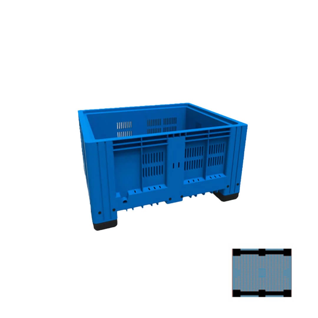 Descripción: Polietileno de alta densidad, resistencia máxima ante agentes acidos, basicos y alcalinos. U.V. estabilizado, 100% reciclable. Sin superficies cortantes, seguros al apilarse. Grado alimenticio aprobado por la FDA, el BIN ranurado. Dimensiones: Largo: 120 cm Ancho: 100 cm Alto: 58 cm 2 Traversas. Color: Azul.
