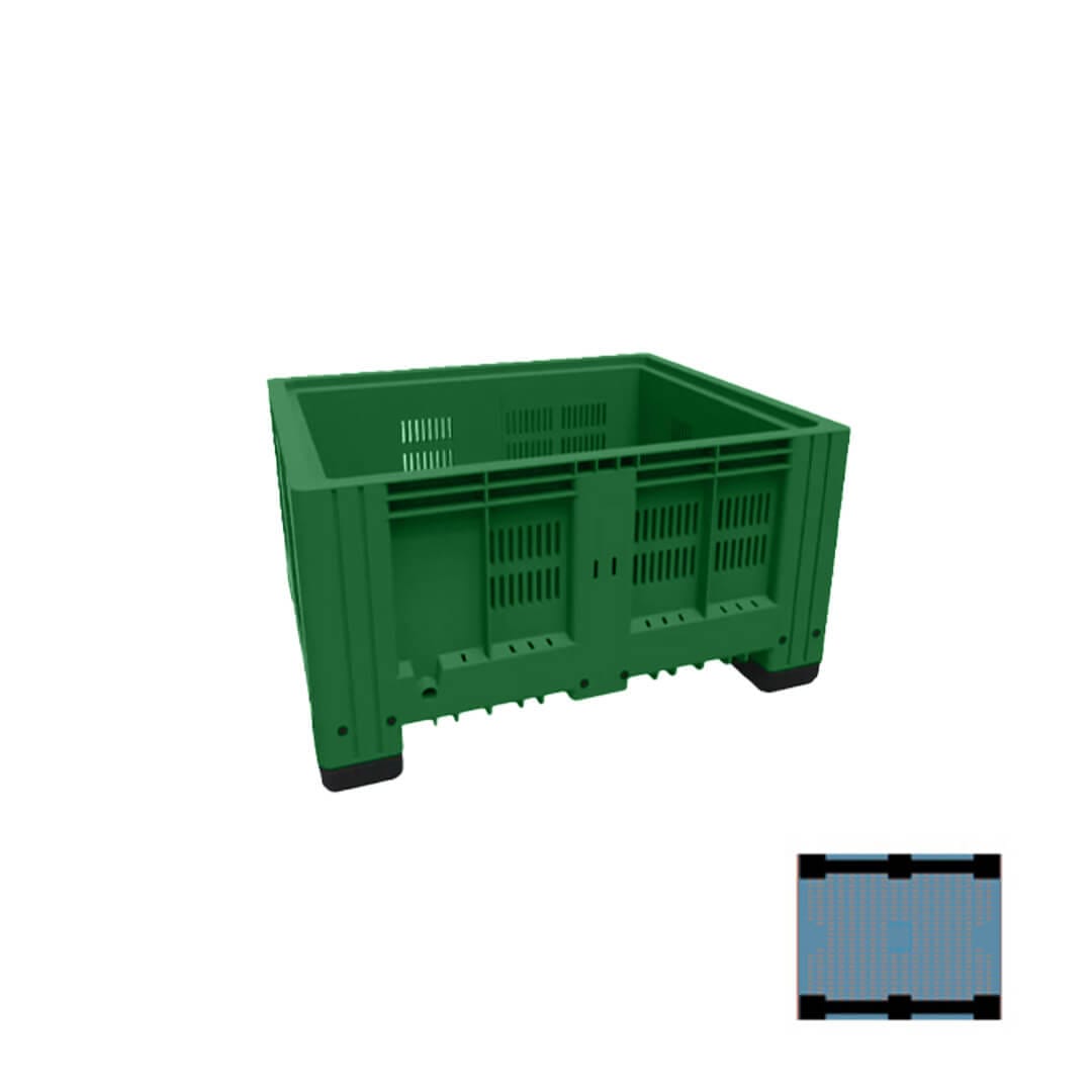 Descripción: Polietileno de alta densidad, resistencia máxima ante agentes acidos, basicos y alcalinos. U.V. estabilizado, 100% reciclable. Sin superficies cortantes, seguros al apilarse. Grado alimenticio aprobado por la FDA, el BIN ranurado. Dimensiones: Largo: 120 cm Ancho: 100 cm Alto: 58 cm 2 Traversas. Color: Verde.
