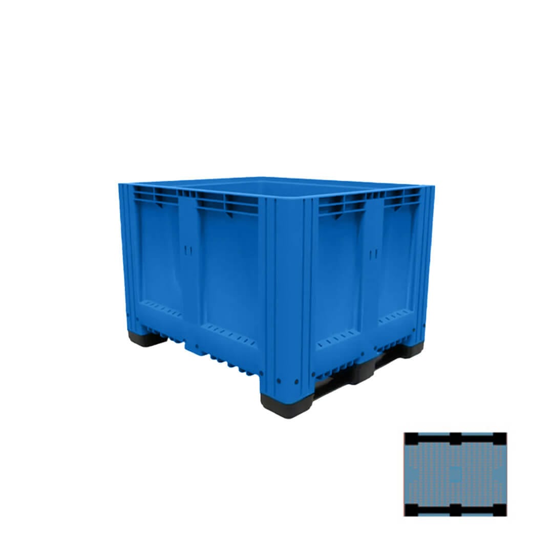 Descripción: Polietileno de alta densidad, resistencia máxima ante agentes acidos, basicos y alcalinos. U.V. estabilizado, 100% reciclable. Sin superficies cortantes, seguros al apilarse. Grado alimenticio aprobado por la FDA, el BIN cerrado. Dimensiones: Largo: 120 cm. Ancho: 100 cm. Alto: 76 cm. 2 Traversas. Color: Azul.