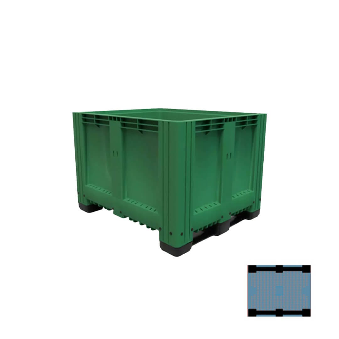 Descripción: Polietileno de alta densidad, resistencia máxima ante agentes acidos, basicos y alcalinos. U.V. estabilizado, 100% reciclable. Sin superficies cortantes, seguros al apilarse. Grado alimenticio aprobado por la FDA, el BIN cerrado. Dimensiones: Largo: 120 cm. Ancho: 100 cm. Alto: 76 cm. 2 Traversas. Color: Verde.