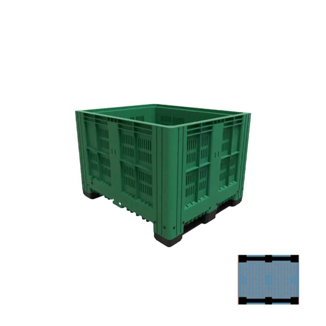 Descripción: Polietileno de alta densidad, resistencia máxima ante agentes acidos, basicos y alcalinos. U.V. estabilizado, 100% reciclable. Sin superficies cortantes, seguros al apilarse. Grado alimenticio aprobado por la FDA, el BIN ranurado. Dimensiones: Largo: 120 cm. Ancho: 100 cm. Alto: 76 cm. 2 Traversas. Color: Verde.