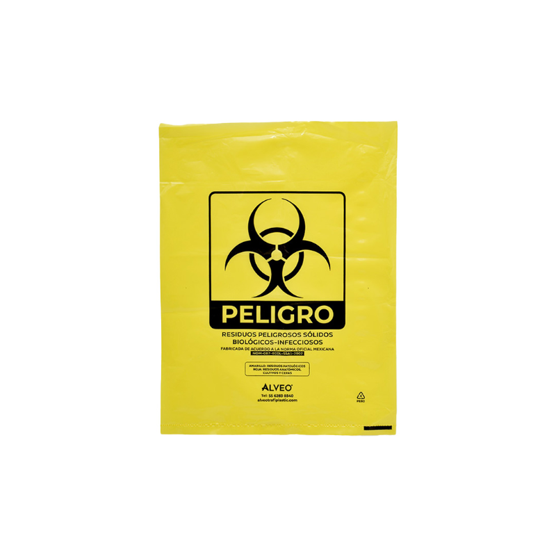 Descripción: Bolsa de polietileno de baja densidad, libre de metales pesados para la recolección de residuos biológico infecciosos. Carga Máxima: 3 kg. Impresa a una tinta con logotipo de biológico infeccioso. Sin fuelles. Calibre 300. Medidas: Ancho: 30.0 cm. Alto: 40.0 cm. Color: Amarillo.