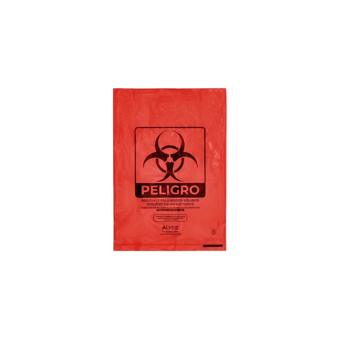 Descripción: Bolsa de polietileno de baja densidad, libre de metales pesados para la recolección de residuos biológico infecciosos. Carga Máxima: 1 kg. Impresa a una tinta con logotipo de biológico infeccioso. Sin Fuelles. Calibre 200. Medidas: Ancho: 20.0 cm. Alto: 30.0 cm. Color: Rojo.