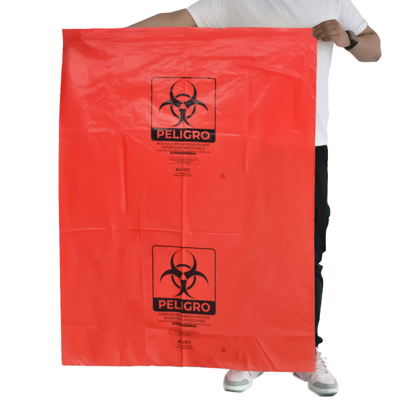 Descripción: Bolsa de polietileno de baja densidad, libre de metales pesados para la recolección de residuos biológico infecciosos. Carga Máxima: 30 kg. Impresa a una tinta con logotipo de biológico infeccioso. Con fuelles. Calibre 300. Medidas: Ancho: 90.0 cm. Alto: 120.0 cm. Color: Rojo.