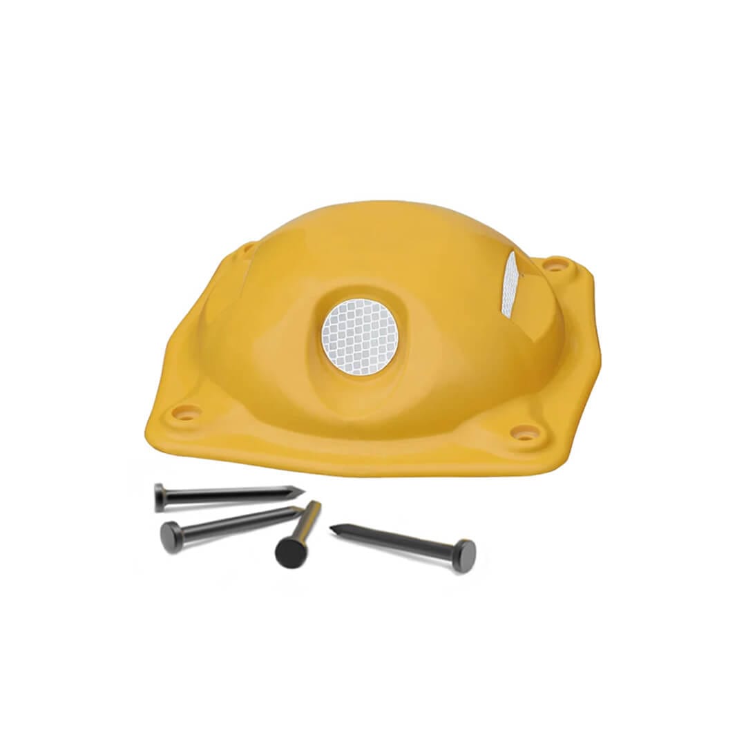 Descripción: Fabricada en polietileno de alta densidad. Acabado en color amarillo. Incluye 4 clavos de 1/4” x 2 1/2” de acero. Alta resistencia. Medidas: 20 cm por lado altura 6.8 cm. Reflejante alta intensidad ambas caras.