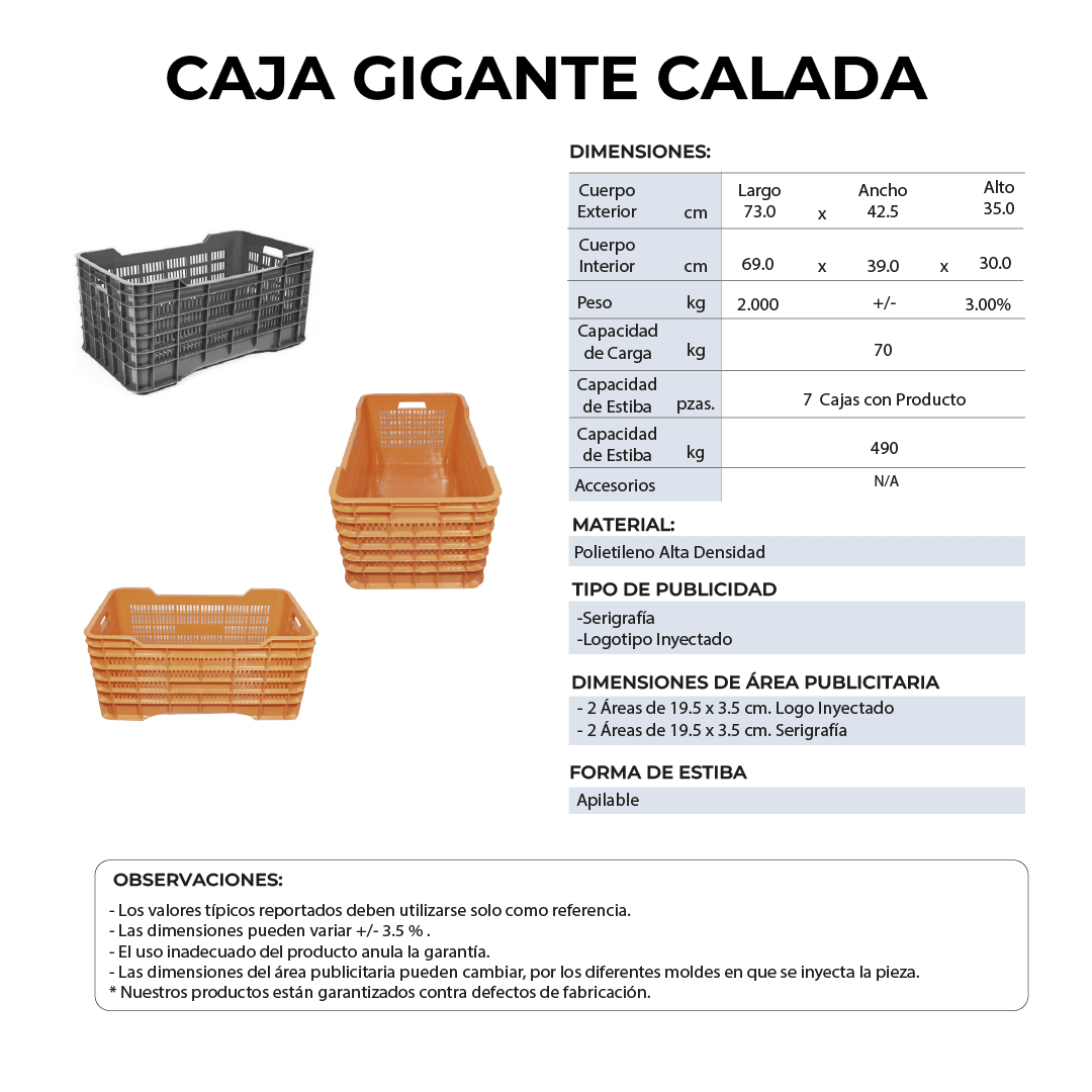 Descripción: Material: Polietileno de reproceso. Medidas: Largo: 73.0 cm. Ancho: 42.5 cm. Alto: 35.0 cm. Peso: 3.865 Kg. Capacidad: 70 Kg. Forma de estiba/empaque: Apilable. Condiciones de estiba: 7 piezas con producto. Color: Negro. Sujeto a disponibilidad. En reproceso no se garantiza color.