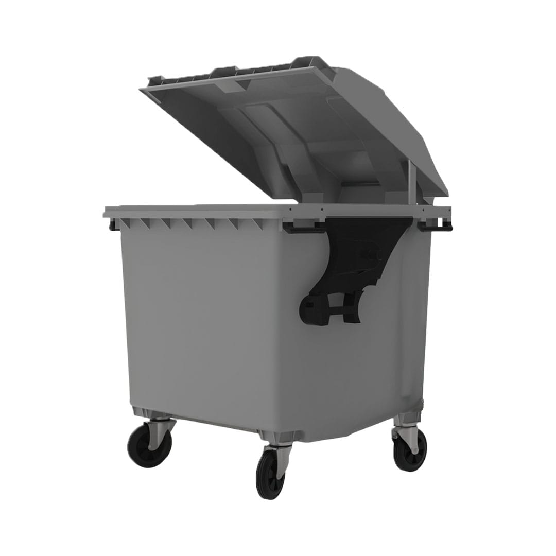 Descripción: Fabricado en polietileno de alta densidad. Contenedor con tapa y ruedas de hule. Capacidad: 1100 Litros. Color: Gris Claro. Con laterales para levantamiento y vaciado. Ancho: 109.5 cm, Largo: 135.0 cm, Alto: 131.5 cm. Sin pedal.