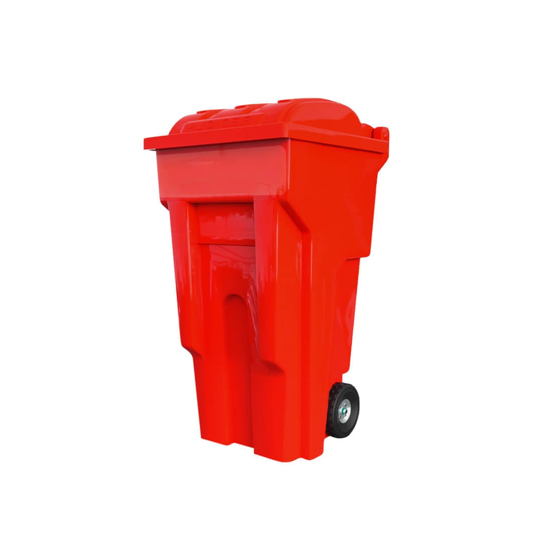 Descripción: Fabricado en polietileno de media densidad. Contenedor con tapa y ruedas de hule, Capacidad: 240 Litros. Color: Rojo. Largo: 72.0 cm. Ancho: 67.0 cm. Alto: 105.0 cm.