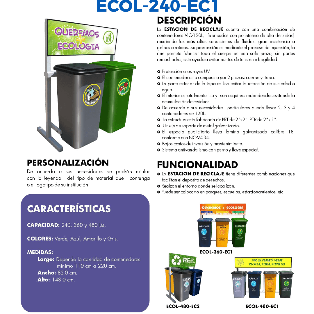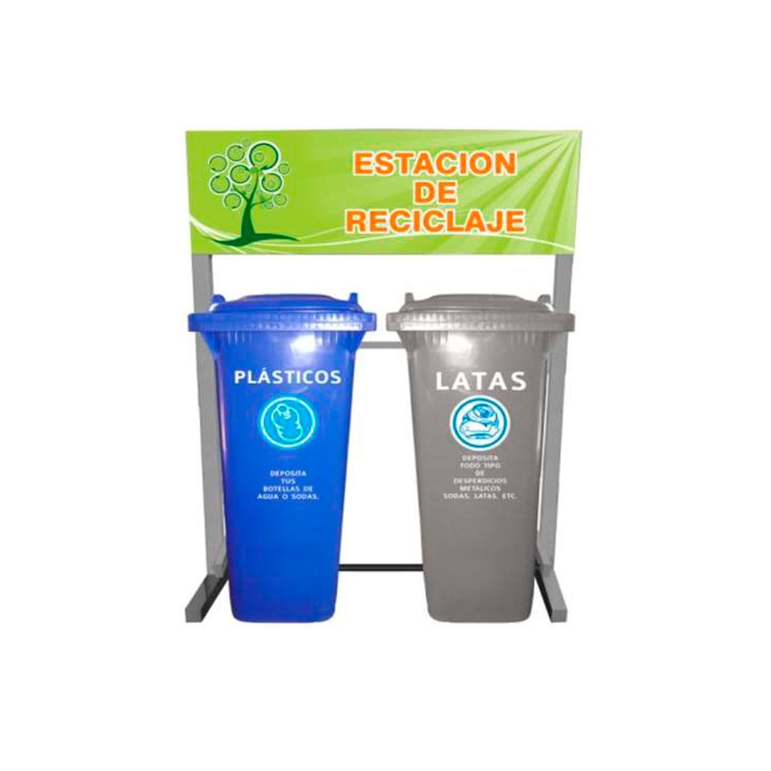 Descripción: Capacidad por contenedor: 120 lts. Color del contenedor: Verde, gris, amarillo y azul. Medidas del contenedor: Largo: 47.0 cm. Ancho: 54.0 cm. Alto: 94.0 cm. Color de soporte: Gris Claro. Medidas estación: Largo: 110.0 cm. Ancho: 78.0 cm. Alto: 148.0 cm. Capacidad total de reciclaje 240 lts. Espacio publicitario con una cara al frente. Costo de personalización de logos y leyendas en vinil impresión dfigital y vinil en contenedores de acuerdo a proyecto no incluido.
