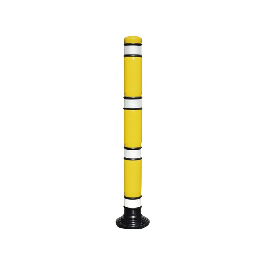 Descripción: Fabricado de polietileno de alta densidad, con tratamiento para rayos U.V. Conformado por soporte, base módulo, módulo (poste), copete y anillos. Color: Amarillo. Base Color: Negro. Se atornilla por la base al piso, con franjas de reflejante en los anillos de unión. Con reflejante prismático. Altura total 113.5 cm.