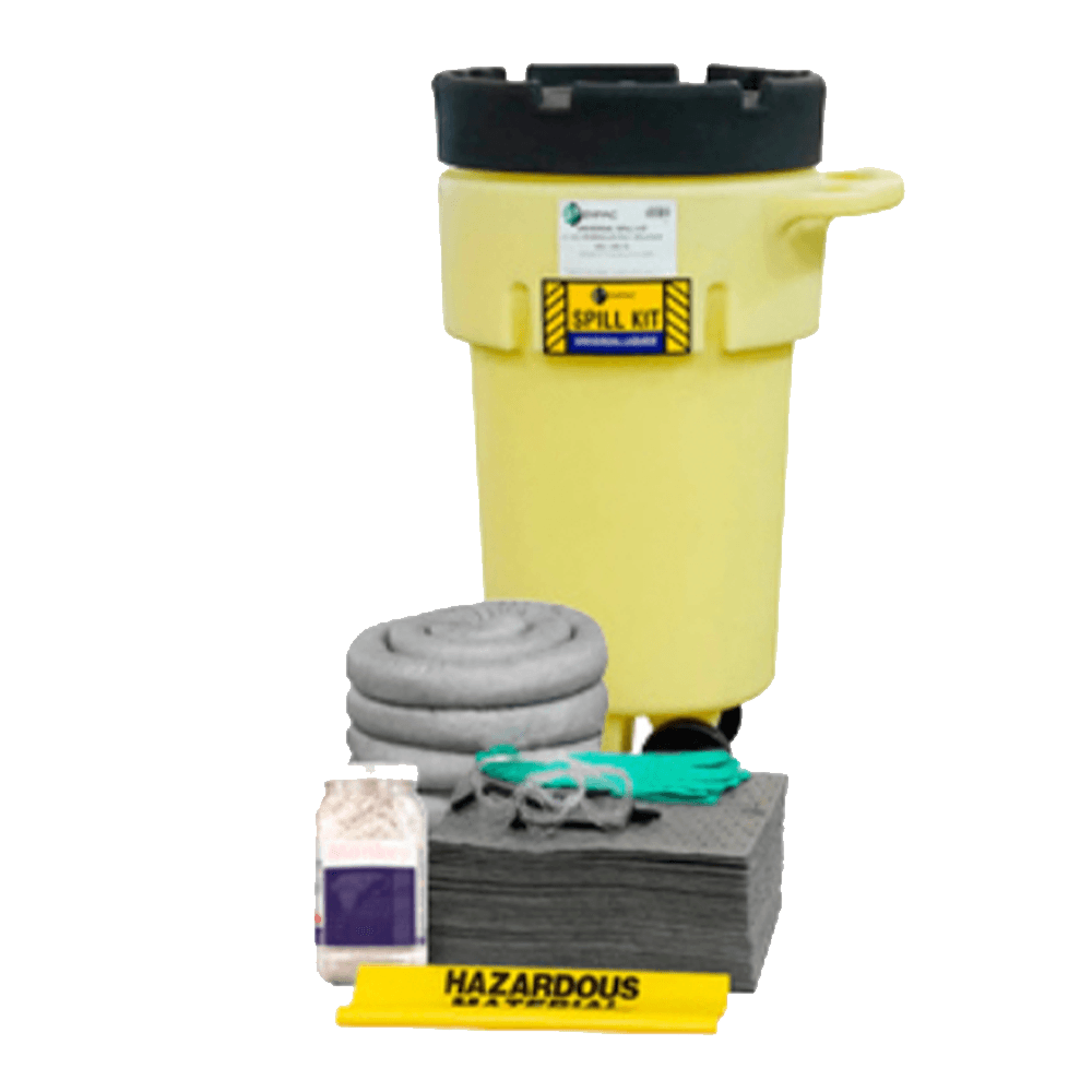 o aceites. Aprobado por Normas: 29 CFR 1910.1450(e), 40 CFR 112.7, 40 CFR 122.26, 40 CFR 263.30(a), 40 CFR 263.31, EPA, SPCC y NPDES. Incluye 40 toallas absorbentes, 5 calcetines absorbentes, 4 bolsas para Residuos Peligrosos, 2 pares de guantes de Nitrilo, 2 goggles protectores, labsorbente granular y 1 Tambor de Salvamento (Poly SpillPack). Medidas: 61 x 74 x 115 cm. Peso: 25 Kg. Capacidad de absorción: 80 Lts.