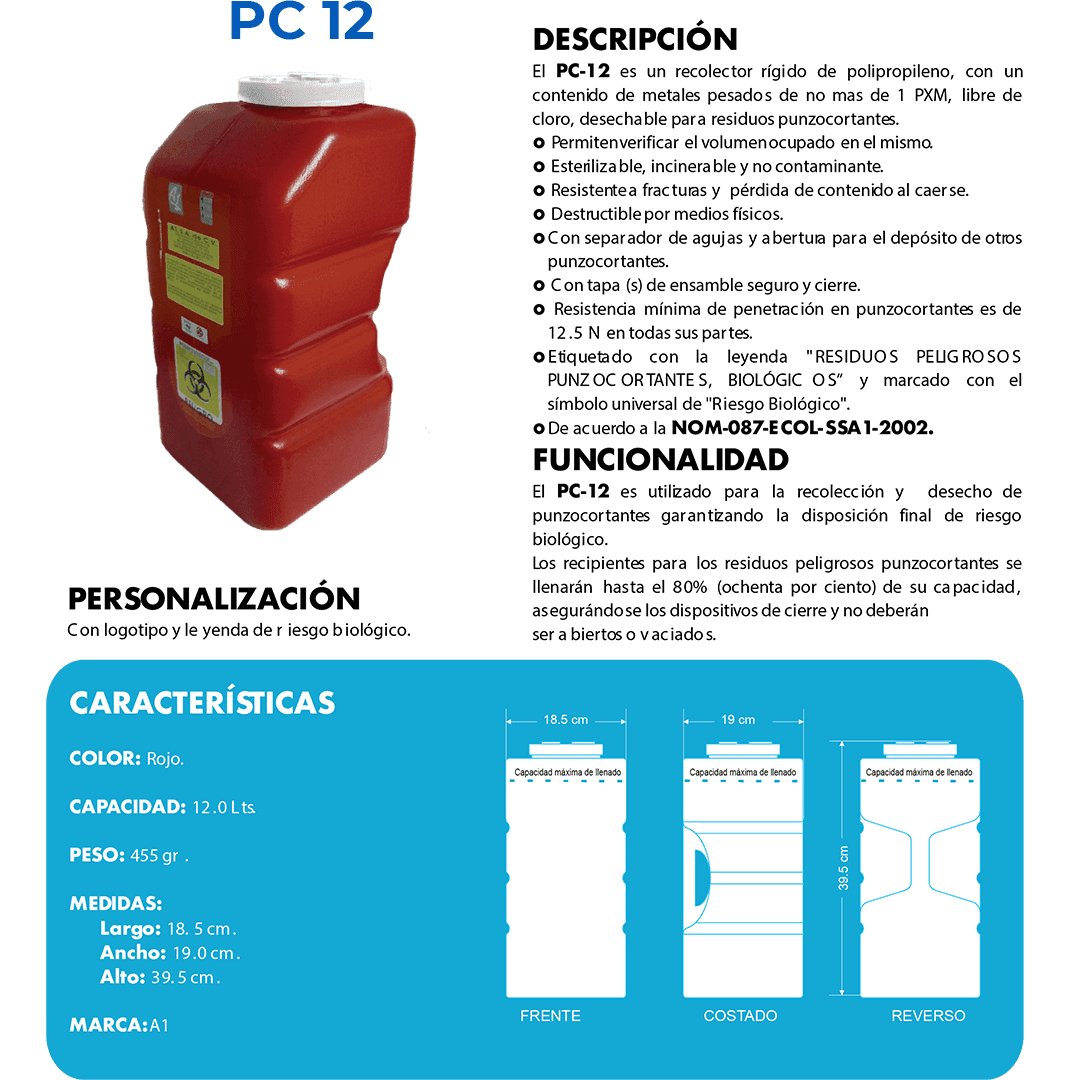 Descripción: Recolector de polipropileno para punzocortante. Capacidad Volumen: 12.0 Litros. Medidas: Largo: 18.0 cm. Ancho: 19.5 cm. Alto: 40.6 cm.