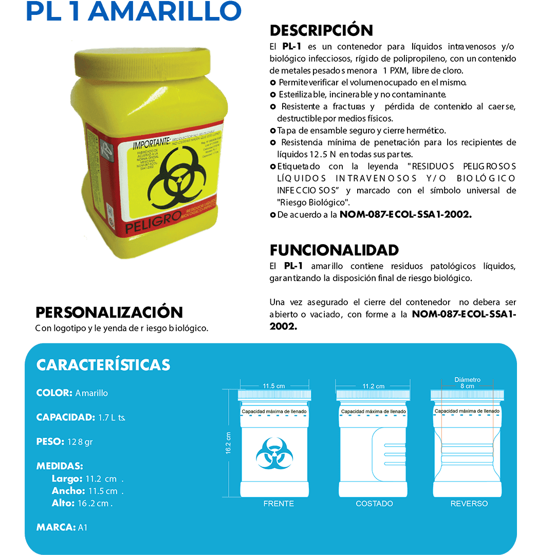 Descripción: Recolector de polipropileno para líquidos. Económico. Capacidad Volumen: 1.7 Litros. Medidas: Largo: 11.0 cm. Ancho: 11.5 cm. Alto: 16.5 cm.