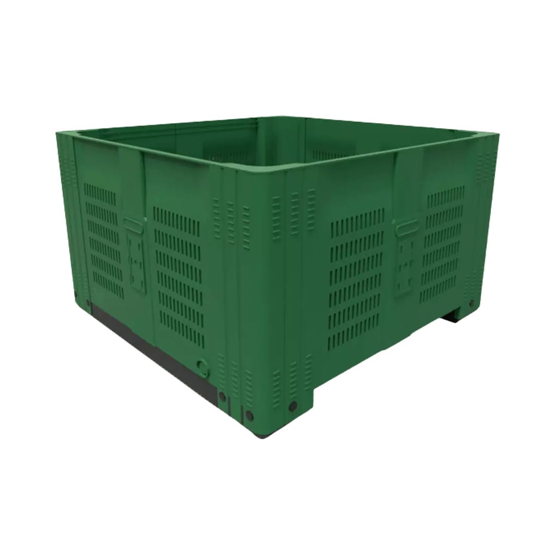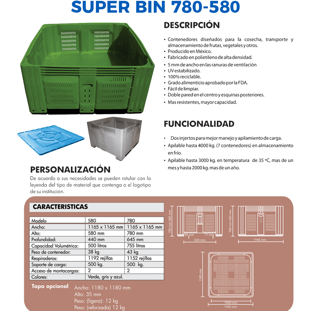 Descripción: Contenedor fabricado en polietileno de alta densidad. Grado alimenticio aprobado por la FDA. Doble pared en el centro y esquinas posteriores que refuerzan el contenedor. Soporte de carga comprobada hasta 500 Kg. Apilable hasta 4000 Kg en almacenamiento en frío. Apilable hasta 3000 Kg. en temperatura de 35° C más de un mes, y hasta 2000 Kg. más de un año. Con ranuras de ventilación. Medidas: Largo: 116.5 cm Ancho: 116.5 cm Alto: 58 cm Peso: 38 Kg. Capacidad: 580 Lts. Color: Verde. Se reducen de forma sustancial Tiempos y Movimientos.