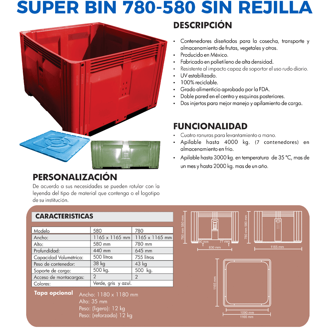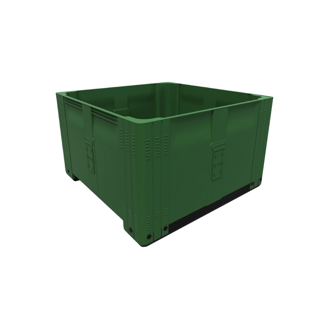 Descripción: Contenedor fabricado en polietileno de alta densidad. Grado alimenticio aprobado por la FDA. Doble pared en el centro y esquinas posteriores que refuerzan el contenedor. Soporte de carga comprobada hasta 500 Kg. Apilable hasta 4000 Kg en almacenamiento en frío. Apilable hasta 3000 Kg. en temperatura de 35° C más de un mes, y hasta 2000 Kg. más de un año. Sin ranuras de ventilación. Medidas: Largo: 116.5 cm Ancho: 116.5 cm Alto: 58 cm Peso: 38 Kg. Capacidad: 580 Lts. Color: Verde. Son ideales para industrias o negocios que requieren mejorar la higiene y presentación de sus productos tales como pollo, carnes y pescados.